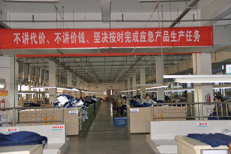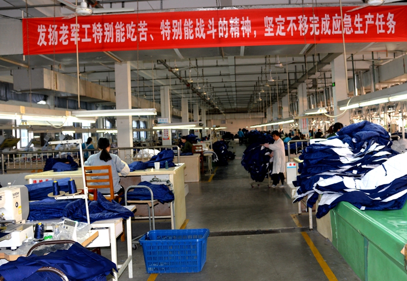 5302公司生产现场 际华5302公司的党员和劳模面对产品的新工艺、新要求,在没有经验可以借鉴的情况下,带领车间班组成员认真学习、反复试验、不断摸索,自制小工具解决生产中的技术难题,在制定大流水作业工艺中,减少了多余的动作,缩短了生产时间,提高了劳动效率。全体生产员工表现出了强烈的主人翁意识,甚至已经退休的员工也主动留了下来,在连续加班加点的情况下,大家都能从大局出发,根据生产进度安排,保质保量地完成各自工序生产要求。