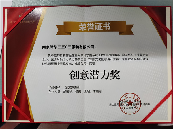 近日,从第二届军服文化创意设计大赛组委会传来好消息,际华3503公司设计团队提交的作品《武戎麾旌》获得创意潜力奖。