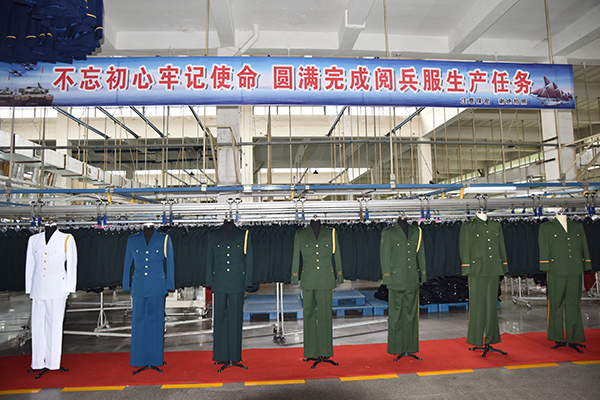 为了进一步激发全员政治觉悟和工作热情,7月3日下午,公司召开了阅兵服任务生产誓师大会,要求各参战单位要树立政治意识、质量意识、交期意识和保密意识,确保此批政治任务保质保量按期完成。公司生产车间悬挂“以完美的阅兵服生产为新中国成立70周年献礼”“不忘初心 牢记使命 圆满完成阅兵服生产任务”等标语,进一步营造气氛、鼓舞斗志。