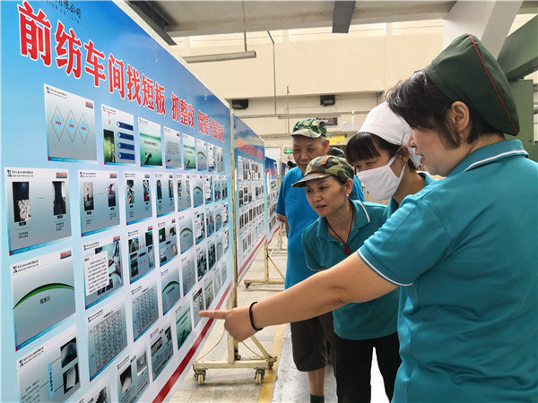 本次图片展集中展示四大事业部共七个生产车间上半年各单位在寻找生产、现场、消耗、安全等方面的短板和整改后取得的成果。展板刚刚布置好,前纺车间立即召集管理人员和轮班班组长,照图索骥为大家上了一堂精益管理找差距课。课程首先介绍了本次巡回展板的目的和意义,并结合日常工作,把精益管理的重要性及其精髓灌输到每位班组长和员工的思想里,进一步强化了班组长对精益管理基础知识的认知。